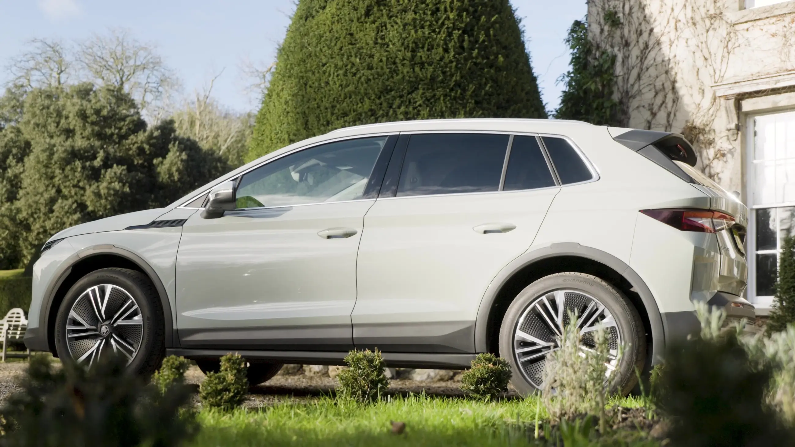 Der Elroq hat eine markante, eigenständige Form, die Aufmerksamkeit erregt, ohne sie zu verlangen. Das Tech-Deck-Face an der Front beherbergt und verbirgt Kamera und zahlreiche Sensoren, eingerahmt von ungewöhnlichen Scheinwerferclustern. Selbst Ferrari, merkt Vicki an, hat Mühe, diese Menge an Technik so sauber zu verstecken. Die neue Farbgebung Timiano Grün steht dem Fahrzeug aus der Nähe ausgezeichnet. Dachgepäckträger und getönte Heckscheiben sind praktische Ergänzungen, während der Heckspoiler die Aerodynamik verbessert, was bei einem Fahrzeuggewicht von knapp über 2.000 kg durchaus relevant ist.